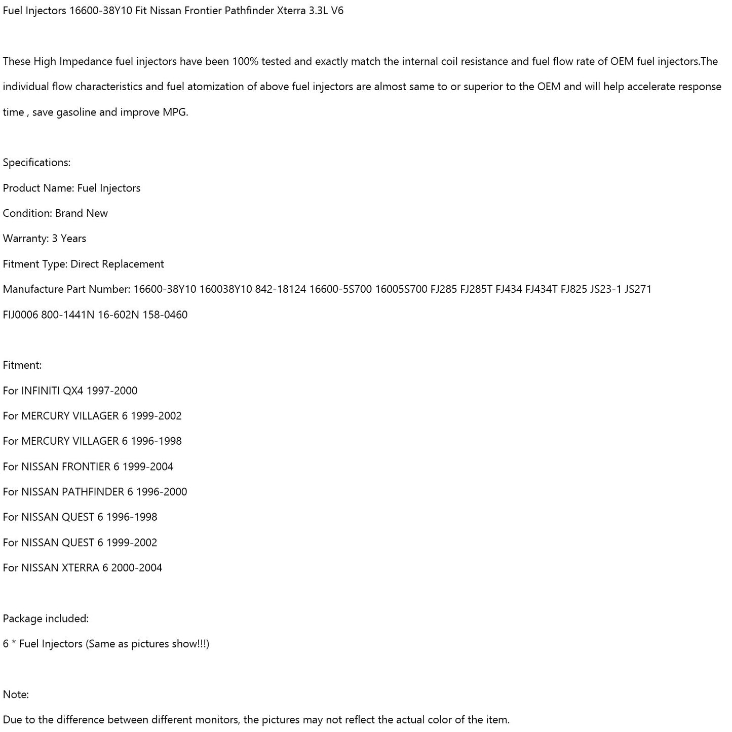 Fuel Injectors 16600-38Y10 Fit For Nissan Frontier Pathfinder Xterra 3.3L V6