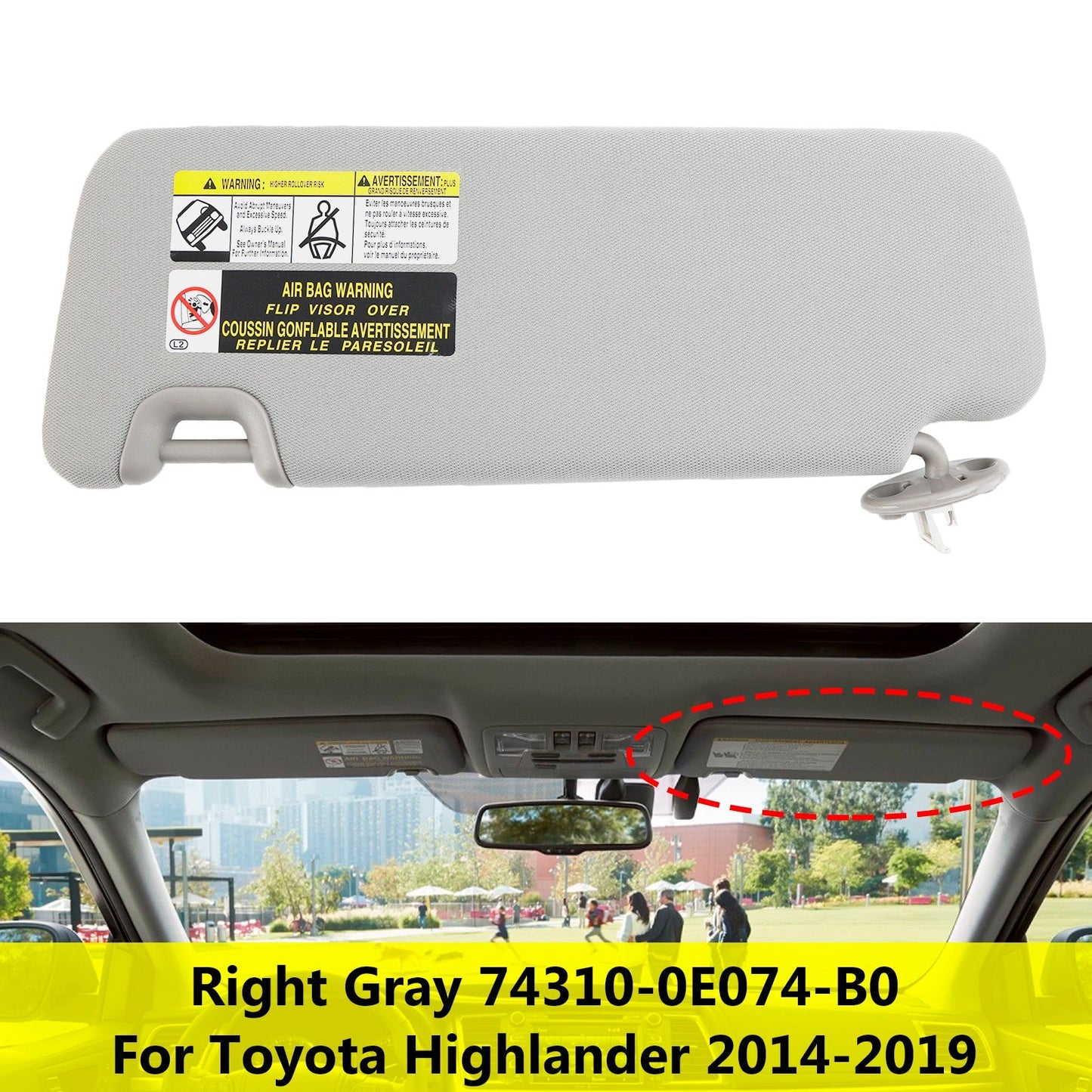 2014-2019 Toyota Highlander Right Sun Visor W/Vanity Light Gray 74310-0E074-B0