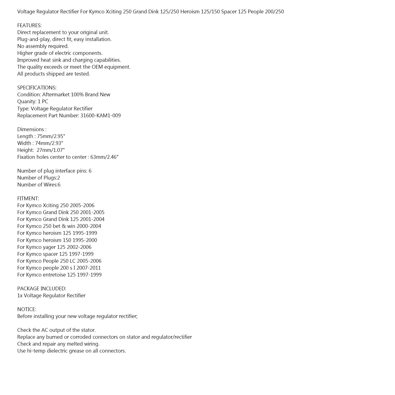 Voltage Regulator Rectifier For Kymco Xciting 250 Grand Dink 125/250 Heroism 125/150 Spacer 125 People 200/250 FEATURES: SPECIFICATIONS: Dimensions : Number of plug interface pins: 6 FITMENT: PACKAGE INCLUDED: NOTICE: Check the AC output of the stator.